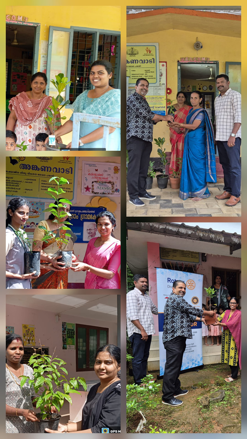 Rotary Club of Trichur, in association with the Rotaract Club of St. Mary’s College, Thrissur, supplied 4–5 fruit saplings each to 15 nurseries (Anganwadis) in Kolazhy Panchayat. In total, 75 fruit saplings were distributed. The planting and maintenance of these saplings are being carried out by the members of the Rotaract Club.